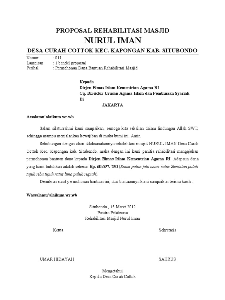 Proposal Permohonan Bantuan Dana pembangunan masjiddocx. Contoh Proposal Pembangunan Masjid Berikut ini adalah contoh proposal pembangunan masjid yang dapat dijadikan sebagai acuan dalam mengajukan atau merencanakan proposal pembangunan masjidSebelum membaca lebih lanjut sobat cakmaman jangan lupa baca basmalah dulu ya agar berkah. Mohon maaf saya copas.
